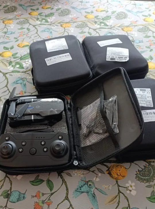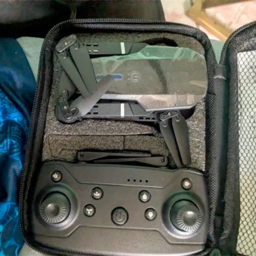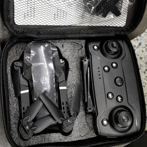Drone VisionFly 4K, control remoto, maletín de transporte, audífonos grises con ANC y un regalo sorpresa.